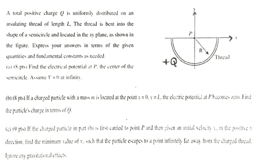 c.) If the charged particle at (b) is first carried to a point P, and then given an initial velocity v0 in the positive y direction, find the minimum value of v0 such that the particle escapes to a point infinitely far away from the charged thread. Ignore any gravitational effects.