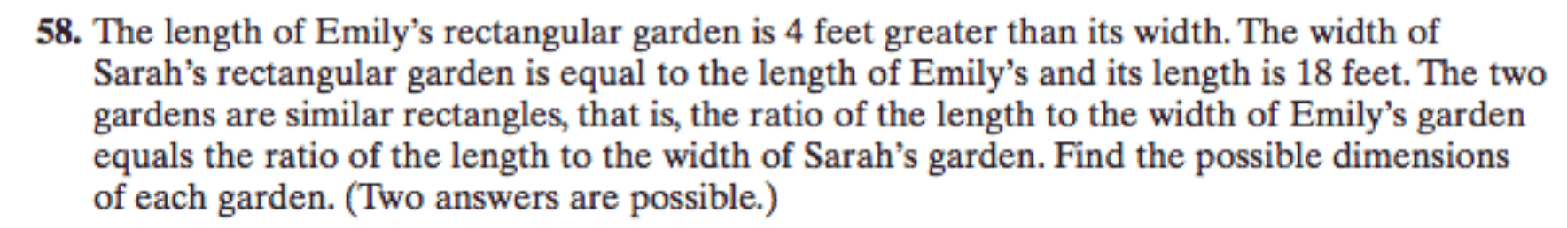The discussion revolves around finding the dimensions of two similar gardens belonging to Emily and Sarah, based on given relationships between their widths and lengths. The problem involves algebraic manipulation and solving a quadratic equation.