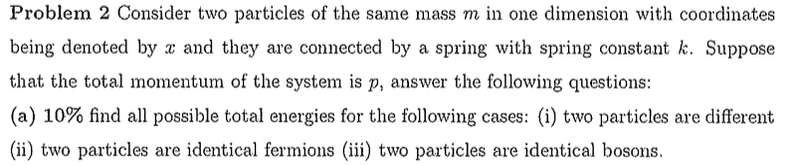 Total energy is the sum of potential and kinetic energy. Now our particles have the same mass and they are one-dimensional. Moreover, they are non-identical. Now potential energy is based on spring constant K therefore V=1/2*K*x^2 . Now considering the harmonic oscillator in classic sense total energy E= T +V