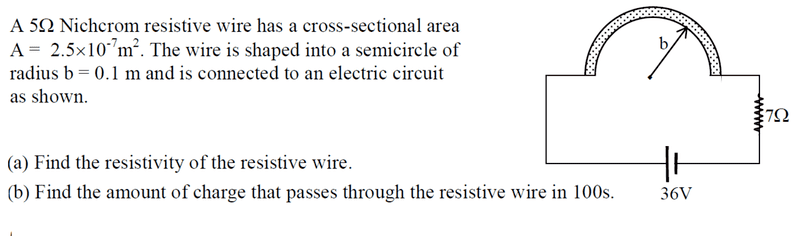 The resistivity of the resistive wire is calculated using the formula ρ = RA/L, resulting in a value of 3.978×10-6 Ωm. The total resistance (Req) is determined to be 12Ω, leading to a current (I) of 3 A when a voltage of 36V is applied. The charge (ΔQ) transferred over 100 seconds is calculated to be 300 C. Rounding the resistivity value may result in loss of credit in academic settings.