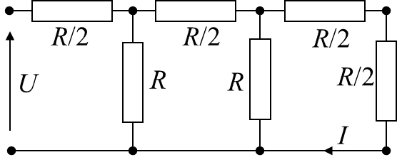 Find the supply voltage of a ladder circuit shown, so that I=7A. Assume R=11Ω. (The unit must be placed)