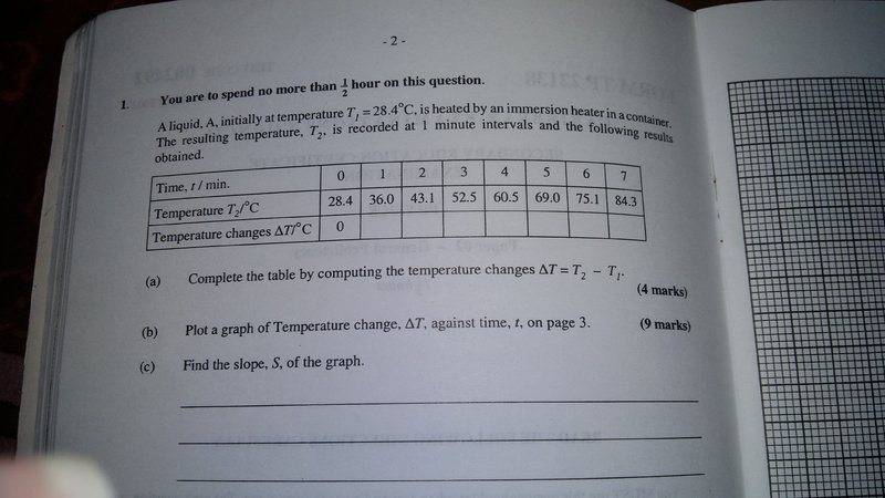 A liquid A initially at temperature T1= 28.4°C, is heated by an immersion heater in container. The resulting temperature T2 is recorded at 1 minute intervals and the following results obtained.