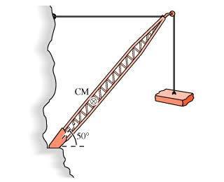 The discussion focuses on calculating the tension in the horizontal cable supporting a crane boom in a marble quarry. The crane supports a 2000 kg slab of marble, while the boom itself weighs 900 kg and is 15 meters long, with its center of mass located one-third from the pivot. The net torque around the pivot point is set to zero, and the torque calculation involves the weight of the boom and the slab, along with the angle of inclination. The solution requires organizing the torque equation to isolate the tension variable.