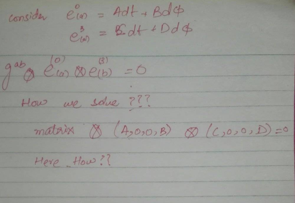 I know how to solve e0⊗e3 but don't know how g⊗e0⊗e3=0 is solved .pervect said:g⊗e0⊗e3=0g⊗e0⊗e3=0g \otimes e0 \otimes e3=0