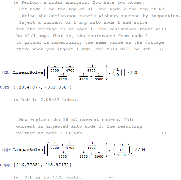 The discussion focuses on finding the Thevenin equivalent circuit for a given network, utilizing Kirchhoff's Voltage Law, Kirchhoff's Current Law, and Ohm's Law. The Thevenin resistance was calculated as Rth = 2.05kΩ using the formula Rth = 2.7 + ((4.7)(3.9)/(4.7+3.9)). Participants clarified the distribution of Thevenin voltage across resistors, emphasizing that it only applies to R1 and R2, while R3 operates independently. Two methods for calculating Thevenin voltage were proposed: using a current divider and short-circuiting the terminals to find the current through Rth.