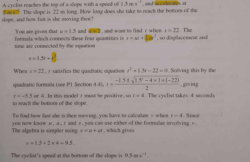 I understand working to solution...my only reservation is on how they used acceleration. The cyclist, i understand was traveling at a constant acceleration of ##2## ##m/s^2## before reaching the top part of the slope.