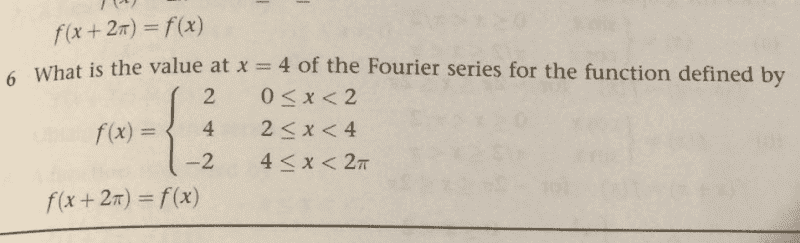 The discussion revolves around finding the value of x in a Fourier series defined within the boundaries of 0 and 2π, specifically addressing the confusion regarding the interval 4 < x < 2π. Participants clarify that the function has jump discontinuities and emphasize the importance of understanding the Dirichlet conditions for Fourier series convergence. The problem does not require calculating the Fourier series itself but rather understanding its properties and behavior within the specified interval.