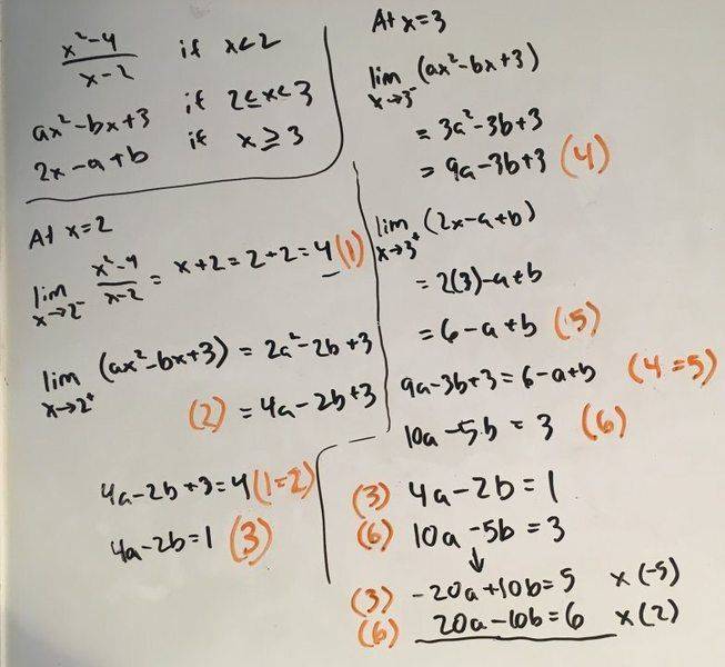 The problem I have is, when I get to the last step, I'm trying to cancel out b so I can get just a. When I do that by manipulating the equation (multiplying (3) and (6) the orange writing you see on the board) it ends up canceling out a (so both a and b). Did I go wrong somewhere?
