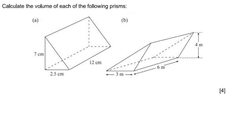 This is a textbook question and i noted that their solution of, $$A=\left[\dfrac{1}{2}×3×4×6\right]cm^3$$ is not correct in my opinion as the base is not a right angle. The base can be analysed as a rhombus and the exercise therefore is to find the related angles and sides (possibly use sine and cosine rules). I would appreciate your thoughts on this.