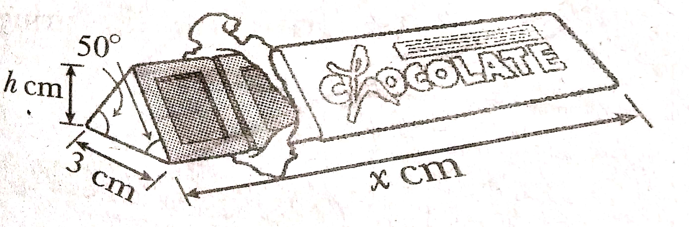 A chocolate company produces triangular chocolate bars. The length of the chocolate bar is x cm, and its cross section is an isosceles triangle. The length of the base side of the cross section is 3 cm, the height is h cm, and the two base angles are 50 degrees.