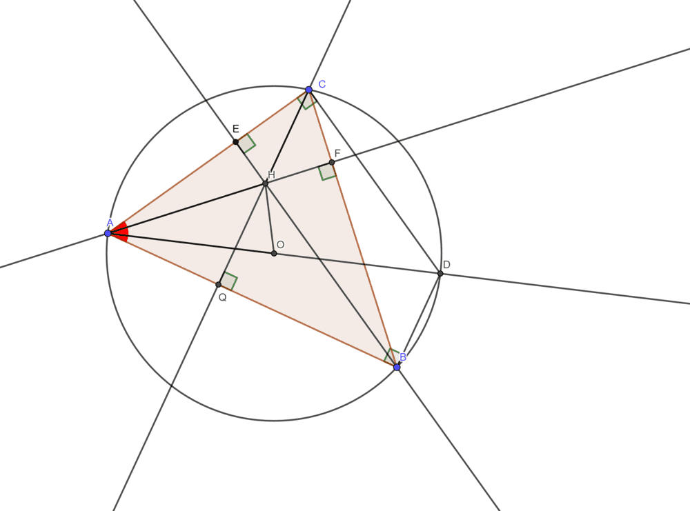 The discussion revolves around finding an angle in an acute triangle inscribed in a circle, given the orthocenter's properties and certain geometric relationships. The problem involves concepts from triangle geometry, including the orthocenter, diameters, and properties of angles.