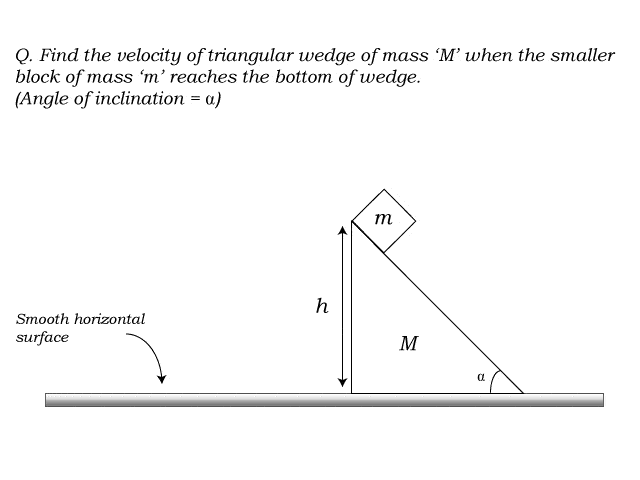 I tried to solve it by drawing free body diagrams and writing the equations but that seemed enormous and complex too and it seems that it will take a lot of time to solve it by that method. I know that this problem requires me to apply conservation of momentum and energy conservation principle but how? No doubt it can be solved by the traditional method but it would be too long and calculations will be extremely complex. There must be some easier way to do this.