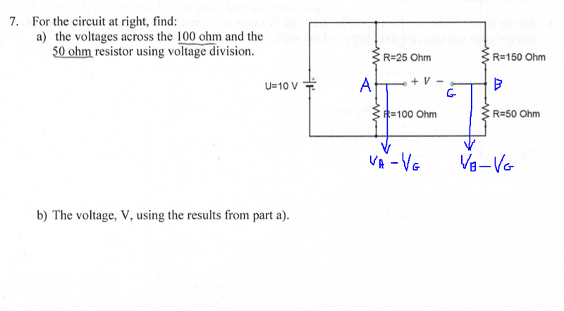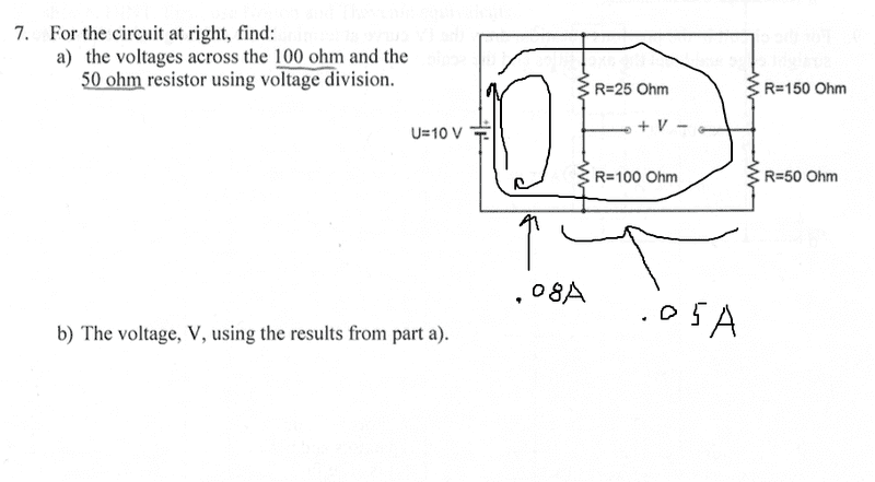 The discussion revolves around applying voltage division to a circuit with resistors and multiple voltage sources. Participants are attempting to understand how to find the voltages across resistors in a circuit that includes both series and parallel components.