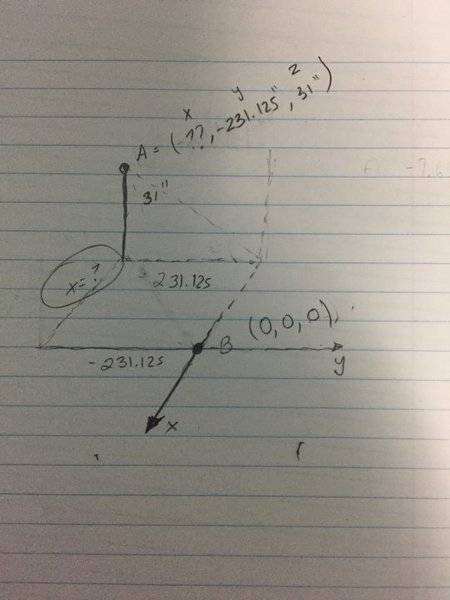 Im thinking of 31^2+(-231.125^2)= hypotenuse= diagonal from B to A. Then I could solve for x since I have 2 sides of the triangle. But I'm not sure if it correct.