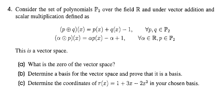 4b). How can I find a basis? I was thinking of the standard basis $\{1,x,x^2\}$, but that doesn't work under the scalar multiplication definition in the vector space.