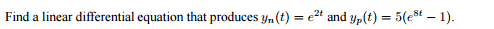 The discussion focuses on solving a linear differential equation, specifically identifying the general solution as the sum of the null solution (complementary solution) and the particular solution. The correct formulation of the general solution is y(t) = Ae2t + 5e8t - 5, where A is a constant. The derivative of the function is calculated as y' = 2e2t + 40e8t. Participants emphasize the importance of finding the nonhomogeneous differential equation corresponding to the given solution.