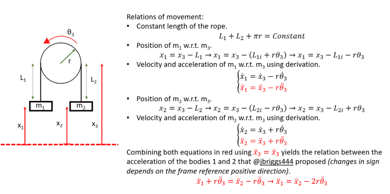 - Participants present various equations of motion and force balances for the blocks, questioning the assumptions made about the accelerations of the different masses. Some suggest drawing diagrams to clarify the motion of the masses, while others express doubt about the correctness of the given answer.