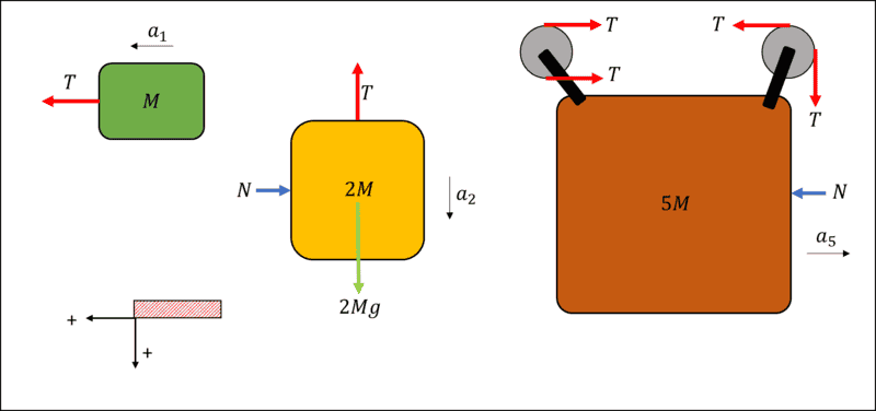 The discussion revolves around determining the initial acceleration of a pulley block system involving masses of 5M, 2M, and M. The setup includes ideal pulleys and an inextensible string, with participants analyzing the forces acting on the blocks.