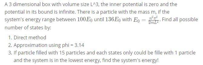 - A 3 dimensional box with volume size L^3, the inner potential is zero and the