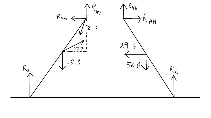 First I let m=3 and g=9.8. I worked out the tension T in the string knowing that it must equal the weight of the particle, giving 29.4N. I worked out the forces on each of the pulleys assuming the tension on either side of them is equal. At A it will be 2Tcos(θ/2) which is 58.0 and at D it will be 2Tcos(1/2*(90-θ)) for which I got 47.7. Also you know that the force on E by the string will be equal to the tension so 29.4N. A quick check of these forces balancing horizontally shows that I am right. Now where I am stuck is on the vertical forces. I am not sure how the reaction forces at B and C and the reaction force between the two rods at A play a role and how could I work them out to show that they balance?