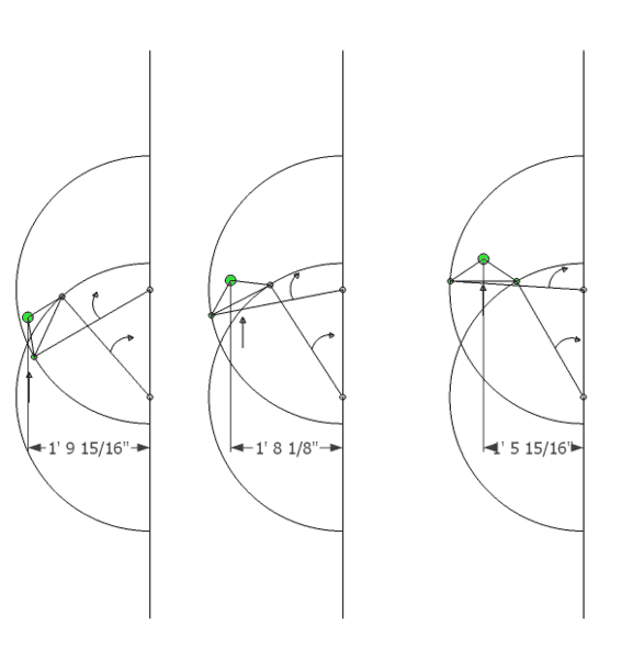 I have attempted to figure out this problem using trial and error on Google Sketchup, but it is very time consuming and I just can't get it close to exact. Diagrams 2 and 3 show the movement of the triangle as the arms pivot.