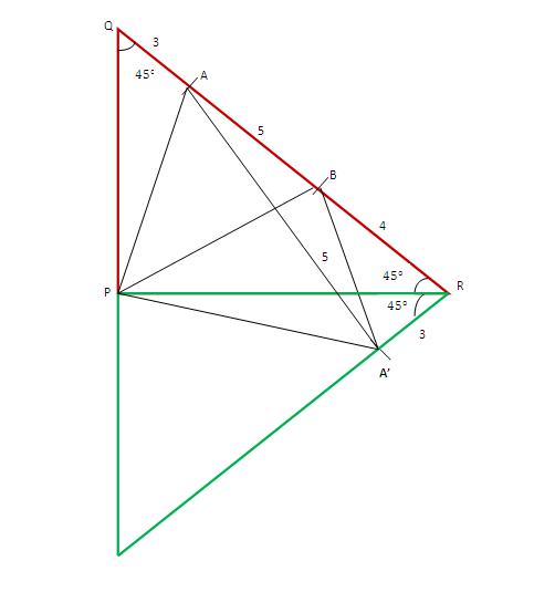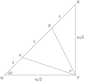 - Using the cosine rule, calculations are presented for triangles $PQA$, $PRB$, and $APB$, leading to the conclusion that $\alpha = 45^\circ$.