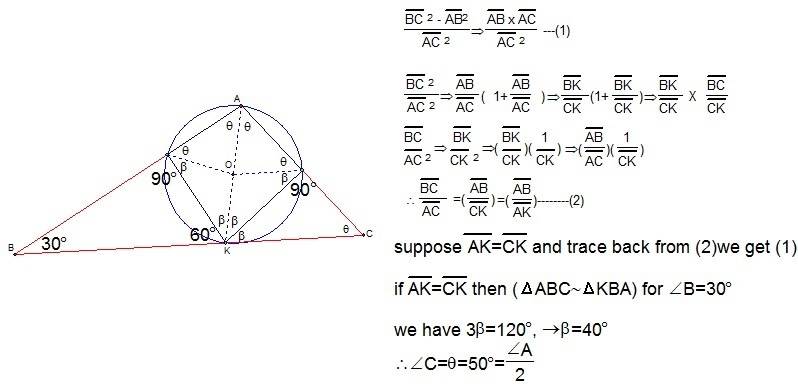 hintAlbert said:$\triangle ABC,\angle B=30^o , \,\,and \,\, \overline{BC}^2 - \overline{AB}^2=\overline{AB}\times \overline{AC}\\