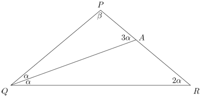 The problem involves finding angle P in isosceles triangle PQR, where PQ equals PR. The angle bisector at Q intersects PR at A, and the relationship QR = QA + PA is established. By applying the sine rule, it is determined that angle α equals π/9, leading to angle β being 5π/9 or 100 degrees. The solution is confirmed through trigonometric identities and the addition formula.