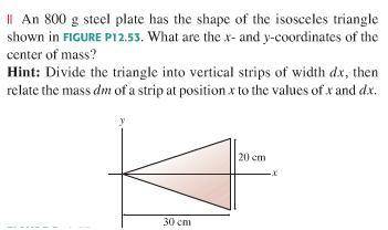 The discussion focuses on calculating the center of mass of an 800 g steel plate shaped like an isosceles triangle. Participants emphasize the importance of understanding the relationship between the triangle's symmetry and its centroid. The correct approach involves using the formula for the center of mass, specifically xcm = 1/M ∫ x dm, where dm represents the mass of a differential area element. The consensus is that, due to the triangle's uniform density, the centroid can be determined without complex integration.