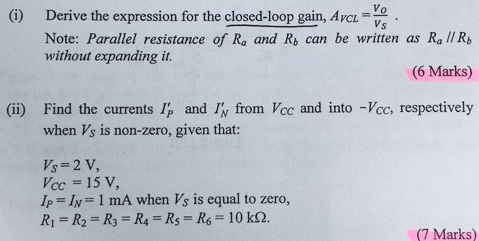 This discussion focuses on calculating the closed loop gain and input currents (Ip and In) in operational amplifiers (op-amps). The user attempts to apply voltage divider principles between resistors R1, R2, R4, and R5 to derive these values. Key concepts include the ideal op-amp assumptions, which state that the input currents are negligible and the voltage at the inverting and non-inverting terminals are equal. The discussion highlights the importance of understanding these principles to solve the problem effectively.