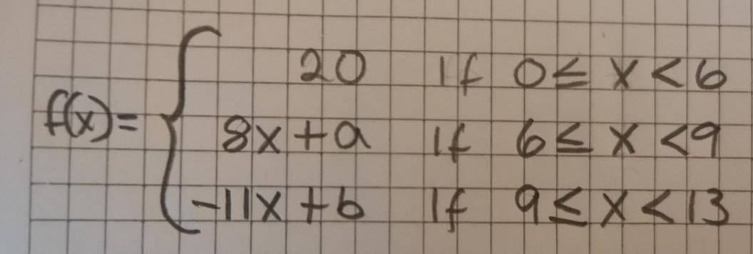 The discussion focuses on finding constants a and b for a piecewise defined function to ensure continuity at x = 6. The correct approach involves setting the limits from both sides equal: $$\lim_{{x}\to{6-}} (20) = \lim_{{x}\to{6+}} (8x+a)$$. This establishes that for the function to be continuous, the left-hand limit must equal the right-hand limit. The participants confirm that this method is valid for determining the constants.