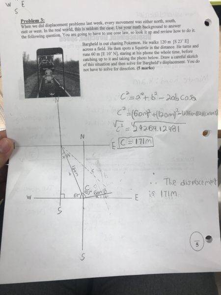 Students studying physics, particularly those focusing on vector analysis and displacement calculations, as well as educators looking for practical examples of the Cosine Law in action.