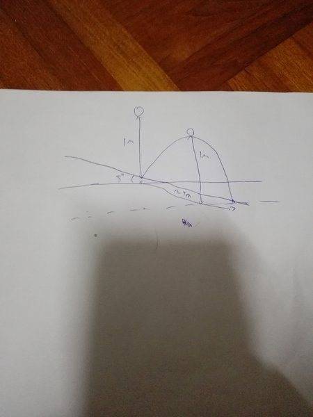 The discussion revolves around a physics problem involving a ball falling from a height of 1 meter onto a slanted surface inclined at 5 degrees. The objective is to determine the distance traveled along the slanted surface after the ball rebounds for the second time, with considerations of kinetic energy conservation.