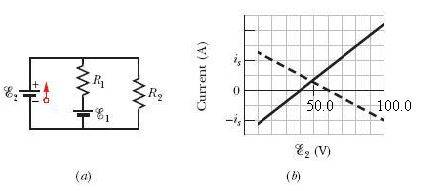 Both batteries in Figure (a) are ideal. Emf 1 of battery 1 has a fixed value, but emf 2 of battery 2 can be varied between 10.0 V and 100.0 V. The plots in Figure (b) give the currents through the two batteries as a function of 2. The vertical scale is set by is = 0.48 A. You must decide which plot corresponds to which battery, but for both plots, a negative current occurs when the direction of the current through the battery is opposite the direction of that battery's emf. What are (a) emf 1, (b) resistance R1, and (c) resistance R2?