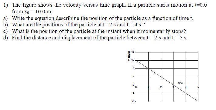 1) The figure shows the velocity versus time graph. If a particle starts motion at t=0.0