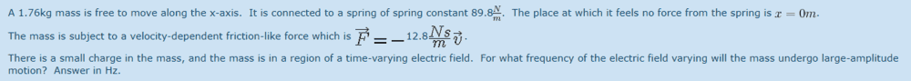 Now I am not really sure how to get w from this. I could argue the mass is at its max amplitude when a=0, but that wouldn't help me find w. If I say x(t)=kx-12.8v, then 1/m would be w^2, but this isn't right. The answer is suppose to be f=0.98 Hz