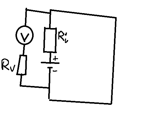 I'm quite lost as to how to solve this question, the battery has a voltage of 1.5V so ##V_0=1.5V## but the voltmeter is reading 0.9V. Now without the right hand portion of the circuit ##R_v## and ##R_i## are in series so the current is given by ##i=\frac{v_0}{R_v+R_i}##, now from KVL ##v_0=i(R_v+R_i)## but my ##i## will just cancel out everything and I'll end up with essentially nothing. Not really sure what to do with the voltmeter reading 0.9V.