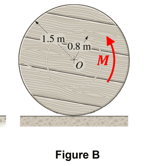 Refer now to Figure B where the spool is allowed to roll on the ground, the tension T has been removed. If the spool rolls without slipping and has the same applied moment M as described above, what is the linear acceleration of the spool? Take right to be positive.