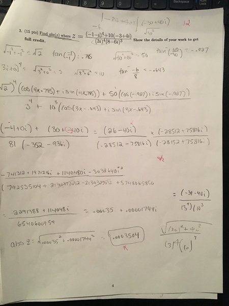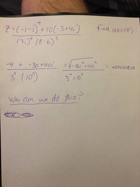 When I solved it on the exam, I did it the long way using De Moivre's theorem. I ended up making a few sign errors which cost me points. When my professor went over the exam, he did the problem as shown on the second picture with the purple pen writing. What I am wondering is why you can solve it this way? Why in the denominator you can just multiple the magnitude of both terms without having to evaluate it?