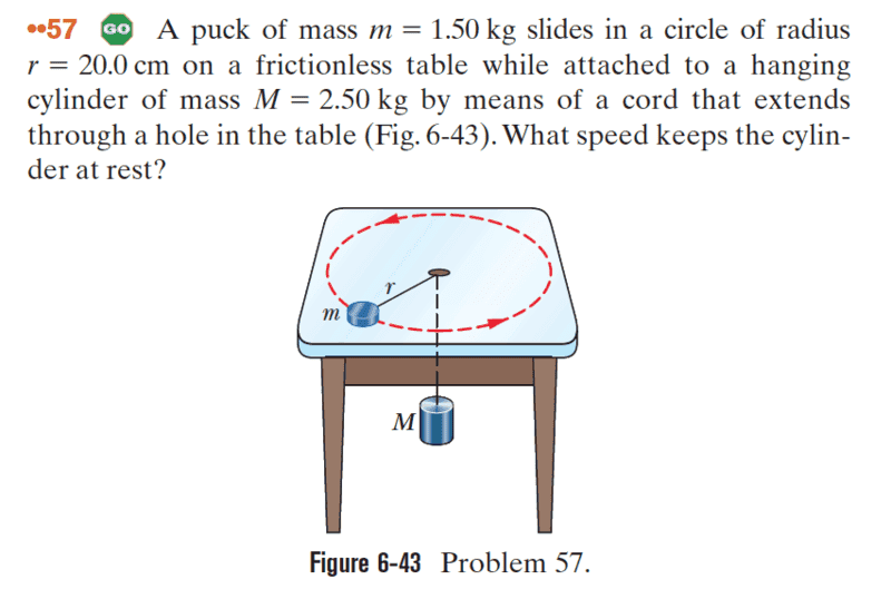 - If a ##1.5## kg mass is rotating at uniform speed on a table and another ##2## kg mass is connected with a string which goes through the hole on the table at the center of rotation of the ##1.5## kg mass making the ##2## kg mass hanging then what should be the speed of rotation of the ##1.5## kg mass to keep the ##2## kg mass stationary?