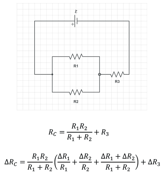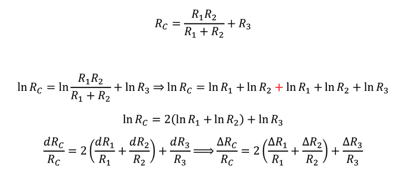 The discussion revolves around finding the absolute error for the equation of total resistance in a circuit, specifically focusing on the equation for ΔRC. Participants are examining the mathematical relationships involved in the equation and the validity of certain logarithmic transformations.