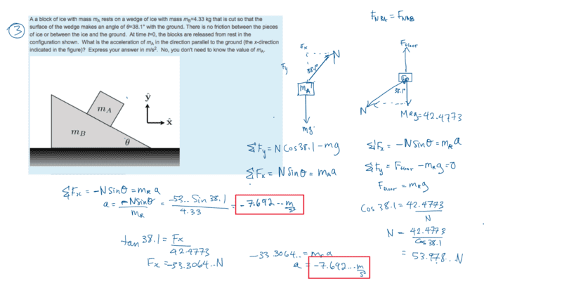 A a block of ice with mass mA rests on a wedge of ice with mass mB=4.33 kg that is cut so that the surface of the wedge makes an angle of θ=38.1° with the ground. There is no friction between the pieces of ice or between the ice and the ground. At time t=0, the blocks are released from rest in the configuration shown. What is the acceleration of mA in the direction parallel to the ground (the x-direction indicated in the figure)? Express your answer in m/s2. No, you don't need to know the value of mA.