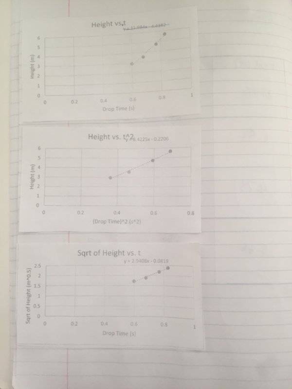 - Basically we did a lab where we dropped a ball and recorded the times then we created 3 graphs. Height vs t, height vs t^2. and sqrt of height vs. t. Where I'm confused is they want us to two 2 values of g from the slopes of the height vs t^2. and sqrt of height vs. t graphs. I thought the slope for height vs t^2 was already acceleration how would we find g from these?
