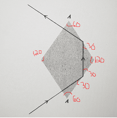 Since I'm dealing with a rhombus, the angle at the bottom(A) and top(A) are the same. Thus, I only have to find the angle at the bottom since the incoming beam is already perpendicular to the side of the rhombus.