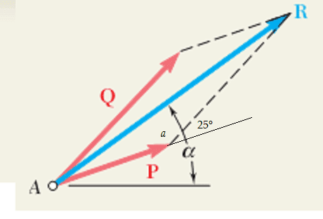 the way I find it is by constructing a parallelogram and knowing that the angles in a parallelogram add up to 360 deg and knowing that the angle between F1 and F2 is 25 deg then I subtracted twice of that to 360 deg getting 310 deg and dividing by 2 I get the angle opposite R as 155 deg.