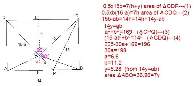 The area of triangle ABQ within rectangle ABCD can be calculated using the given dimensions: AB = 14, CP = 13, and DP = 15. Point P lies on line segment AB, while point Q is positioned on line segment DP, with line segment CQ perpendicular to DP at point Q. The area of triangle ABQ is determined to be 84 square units through the formula for the area of a triangle, A = 0.5 * base * height, where the base is AB and the height is the vertical distance from Q to line AB.