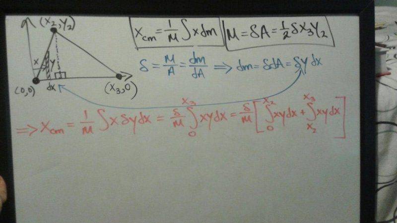1. Show that for an arbitrary uniform triangle ABC, with A at (x1, y1), B at (x2,y2), C at (x3, y3), the CM (xcm, ycm), is simply defined by xcm=(x1+x2+x3)/3, and ycm =(y1+y2+y3)/3