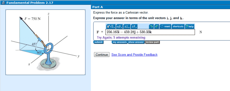 So my answer was: F=(256.165i-459.28j+530.33k)N and it says it's wrong. When i first submitted it, it said check signs, but i don't want to just guess at the signs because it takes off points for wrong answers, and i would like to know what I'm doing wrong.