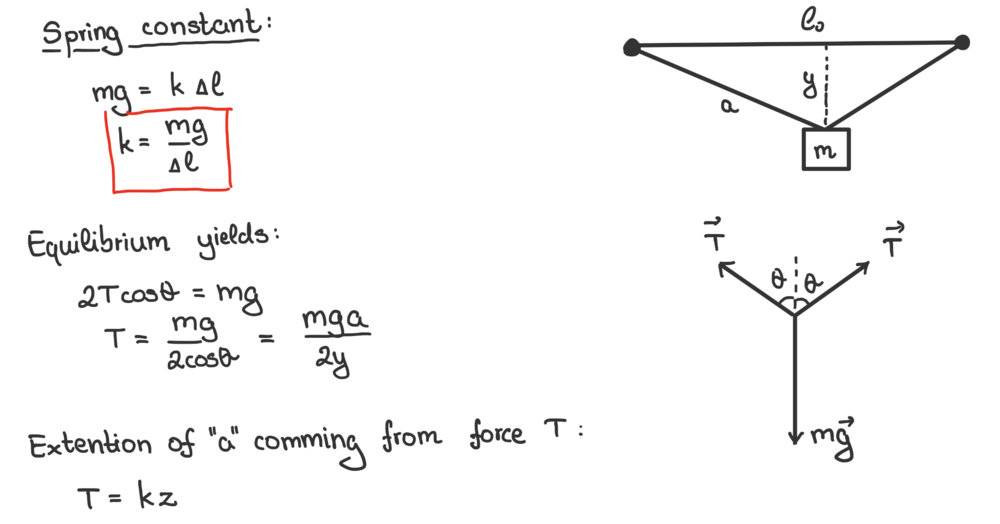 - A wire of unstretched length ##l_o## is extended by a distance ##10^{-3}l_o## when a certain mass is hung from its bottom end. If this same wire is connected between two points, A and B, that are a distance ##l_o## apart on the same horizontal level, and the same mass is hung from the midpoint of the wire as shown, what is the depression y of the midpoint, and what is the tension of the wire?