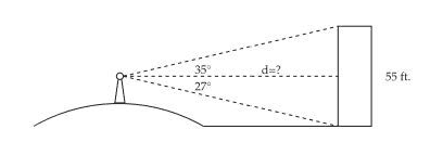 "A woman standing on a hill sees a building that she knows is 55 feet tall. The angle of depression to the bottom of the building is 27°, and the angle of elevation to the top of the building is 35°. Find the straight line distance from the woman to the building."